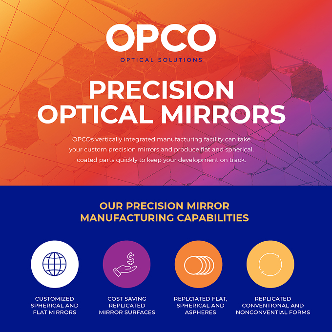 OPCO’s vertically integrated manufacturing facility can take your custom precision mirrors designs and produce flat and spherical, coated parts quickly to keep your development on track.
